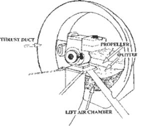 In an integrated hovercraft, the lift air is divided by a splitter, which is usually located at the bottom of the thrust duct, as shown in Figure 15-3a. Located directly behind the propeller, the splitter directs a portion (usually 1/3) of the propeller's total air supply down into the air cushion, which maintains pressure inside the cushion. The rest of the air is forced behind the hovercraft, propelling the hovercraft forward. A diagram of the various paths the intake air travels in an integrated type of hovercraft is shown below.