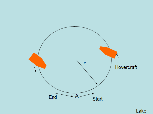 Since the minimum distance between the starting point and the final point is zero, the displacement of the hovercraft is zero feet [0 m]. The unit of distance is feet or meters; the unit of displacement is feet or meters with direction from the initial to the final point.